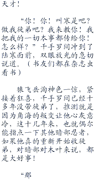 “之后我就开始重视这方面能力,超强的记忆力,对细节的观察能力……有那么一个月的时间,我走遍了木叶的大街小巷,去过上百家商铺,去看不同<div class="divimage"><img src="<div class="divimage"><img src="<div class="divimage"><img src="<div class="divimage"><img src="<div class="divimage"><img src="<div class="divimage"><img src="<div class="divimage"><img src="<div class="divimage"><img src="<div class="divimage"><img src="<div class="divimage"><img src="