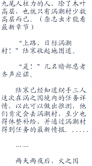 “可是,纲手大人不是说……”这次开口的是加藤裂,他已经恢复情绪,声音有些急,“再说,我们的任务是去水之国,虽然走涡之国的路线也不是不行,可刚刚寒光大人说是要去帮纲手大人他们,这……”