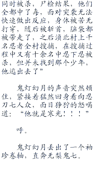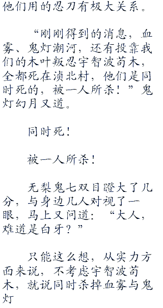 雾隐村早已派出大量斥候忍者与暗部忍者对水之国进行搜寻,雾之忍刀七人众只需要等消息,他们需要一条线索,只要有一条线索能够追查“寒光”,他们机会行动。