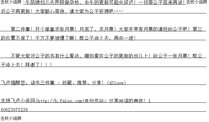 今大上午陪娘妇儿去医院做孕检,中午的更新可能会延迟!一切等公子口来冉说!回来之