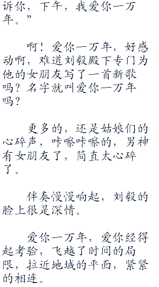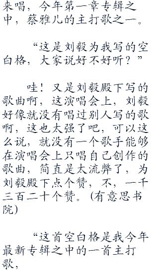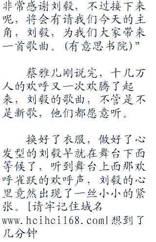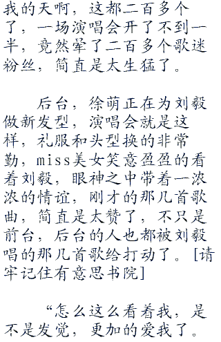 “刚才这首征服,是我最喜欢的作品之一,不得不说,刘毅这个天才少年的称呼名至实归,让我们用掌声,感谢刘毅为我们带来这么多优秀的歌曲,好不好?”娜瑛灿笑着看着舞台下面望不到边际的黑暗,那如星空一般的荧光灯