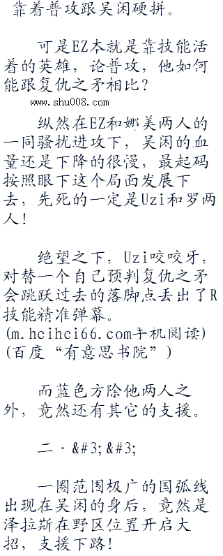 不过吴闲倒也不急,见自己身中虚弱,也不忙替A人,而是调整走位,一口破败吸在娜美身上,在将自己的血量回复少许的同时也增加了移动速度,避免在虚弱过程中被EZ过多的输出到。