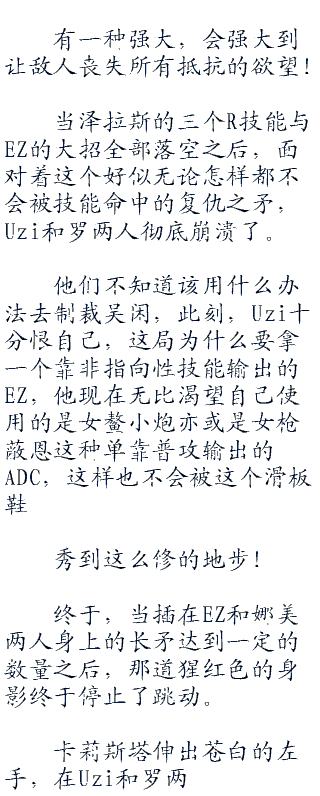 罗在Q技能落空之后,给EZ挂上自己的E技能,又用W技能刷了一下吴闲的血量,最后才将虚弱技能挂在了吴闲的身上。
