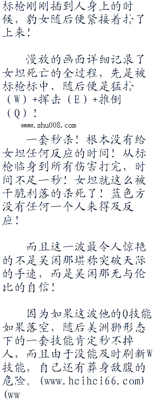 顶在最前面的洞主直接就是闪现W上去,捆住了辅助女坦。此时女坦身上还有豹女的标记在,吴闲随后跟上切换美洲狮形态WEQ直接带走了半血的女坦!