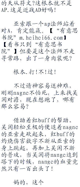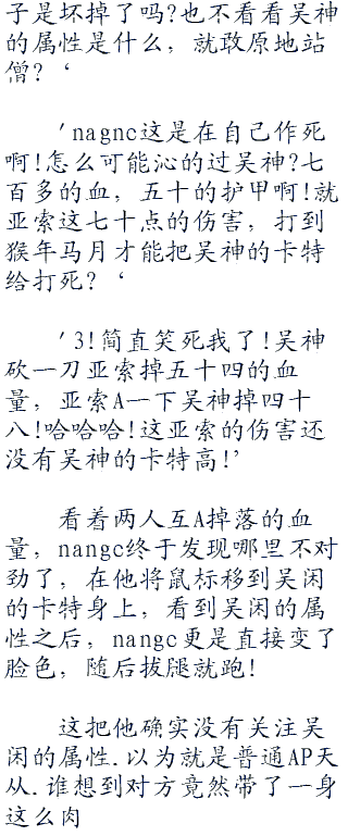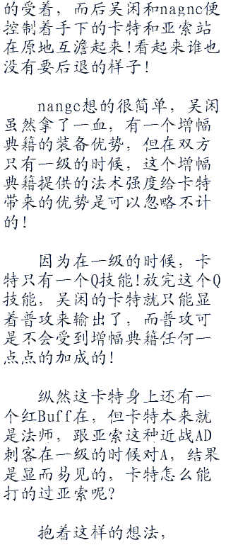 nagne现在也没有了刚刚游戏开始时要狠狠的压制住吴闲的雄心了,他现在只想着赶紧把吴闲身上的红buff持续时间给熬掉就好,要不然他是真的没有和吴闲的卡特对拼的勇气。