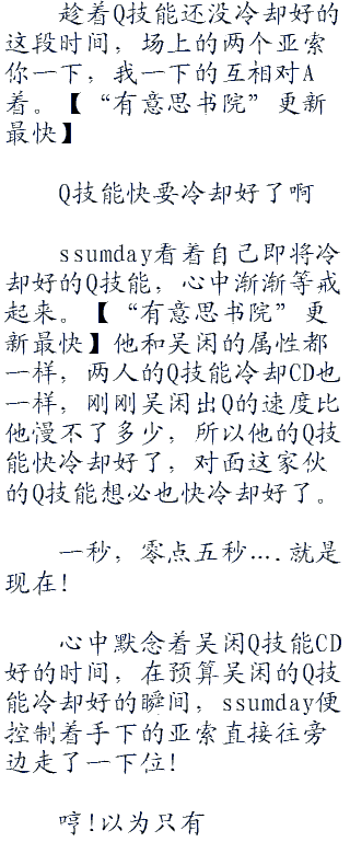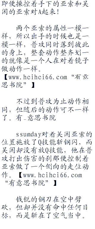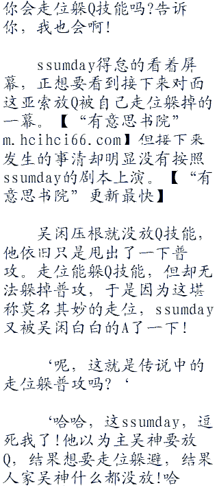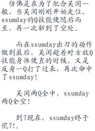 ssumday一边控制着亚索朝着吴闲身边靠近,一边愤愤的说遭。他在和别人sol。的时候都是等小兵上线之后再开始对决的,什么时候一上线就开千了?不过对面这家伙竟然这么主动的挑事,难不成自己还怕了他不成!