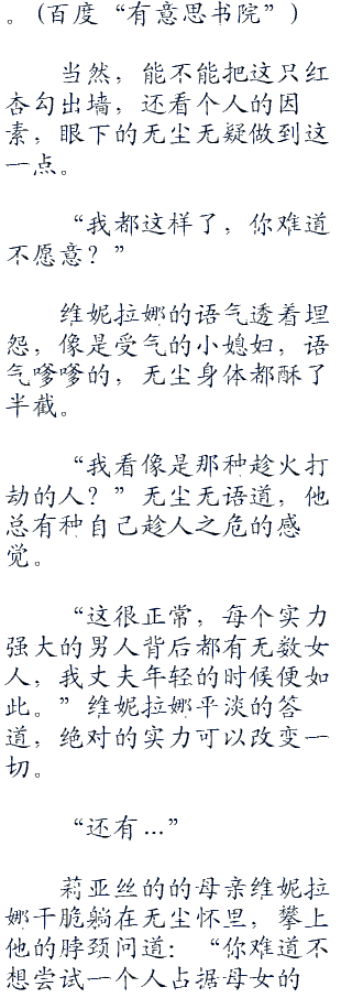 毋庸置疑,莉亚丝的母亲很有心急,很聪明,无尘霸气一方就把她密的天花乱坠是不可能的。