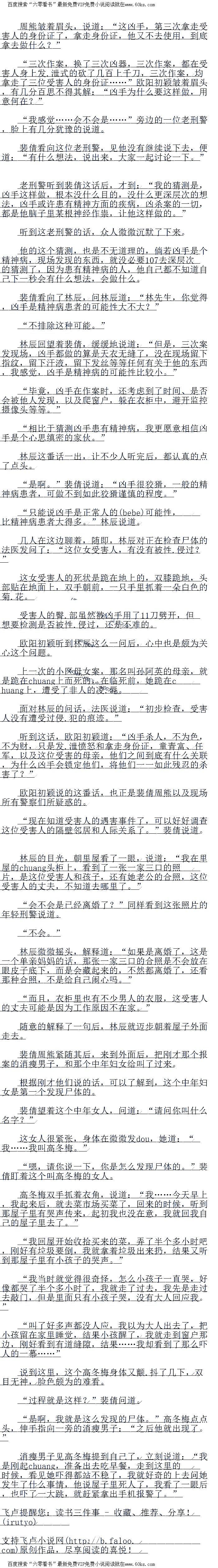 这边是一片老旧的居民区,案发的现场是一栋平房,这栋平房的两边是过路的小道,这个和受害人算是邻居,也是第一个发现凶杀案的女人高冬梅,她就住在案发屋子后面的那间屋子里面。(百度搜索“读书族“,最新章节免费看)