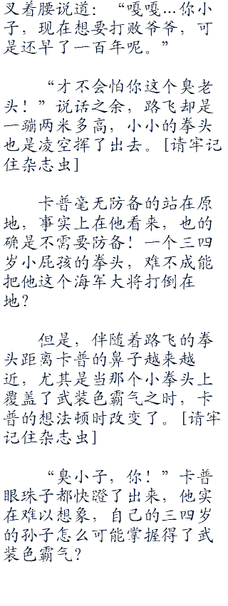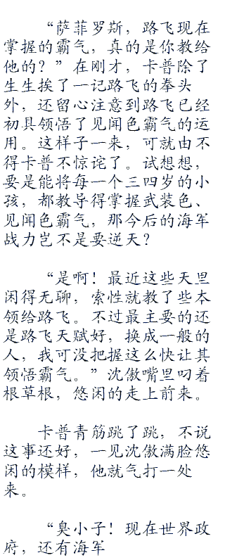 “厉害!路飞这小子绝对是天才啊!前几天,他刚刚掌握了武装色霸气的窍门。没想到这么快,他就能把握到见闻色霸气的脉络了。”沈傲惊喜的说道。