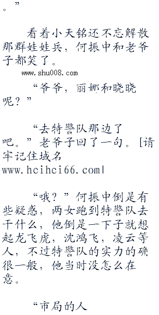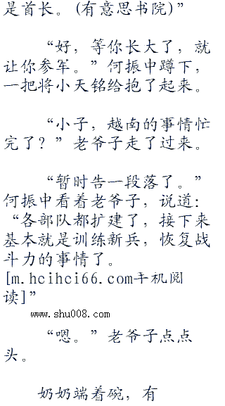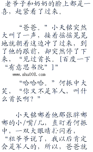 进入大院之后,何振中下车,隔着好一段距离就听见了还略带着奶声奶气的声音,他的脸上立刻露出了笑容,是他的儿子,何天铭。