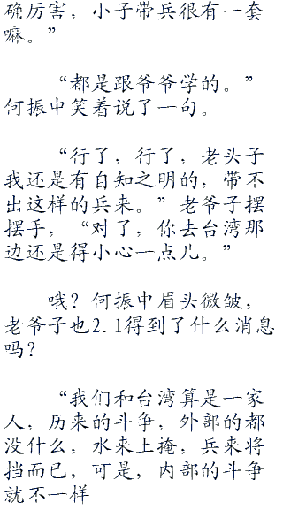 有点儿意思。何振中点点头,看来得好好培养一下了,说不定,以后何家又会多出一个将军呢,满门忠烈,一家四将军,啧啧,多好。