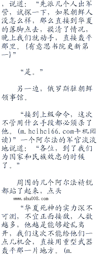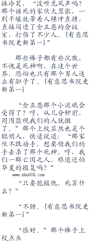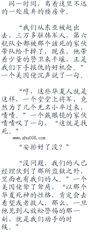“那个该死的华夏人来了平壤,各位,这是我们报仇的好机会。”一名年轻的棒子上校满脸杀机,沉声说道:“春川血仇,我们终于有机会可以雪耻了。”