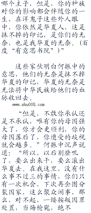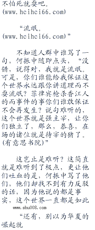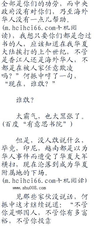 “地球离了谁一样会转,别把你们自己想的那么重要,懂吗?”何振中哼了一句,“也许你们会说你们不愿做华夏人,没关系,华夏欢迎你们离开,随时都可以。也许,你们也会说这里是你们的,也没关系,觉得是你们的,那么来拿吧,打得过大陆,你们想怎么样