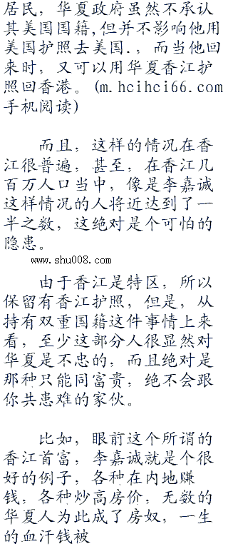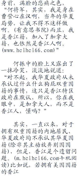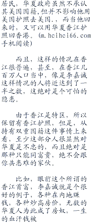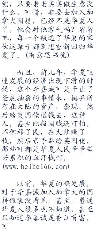 香江特首也张大着嘴,盯着何振中,说不出一个字来,何振中不说,连他都差点儿忘了,这个名义上的香江首富李嘉诚其实早就加入了加拿大国籍,根本不算是香江人了。
