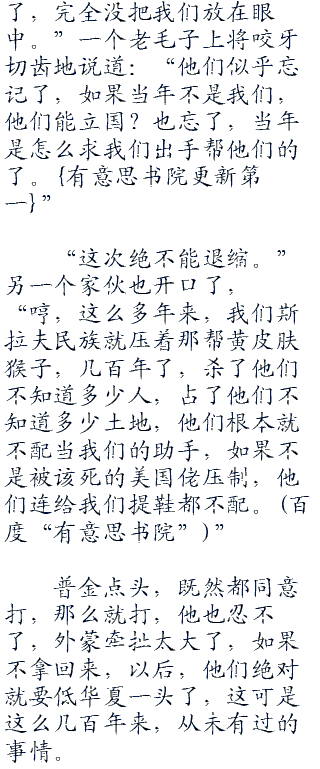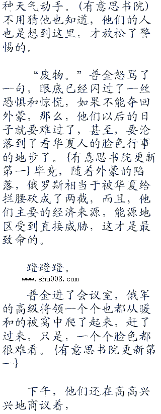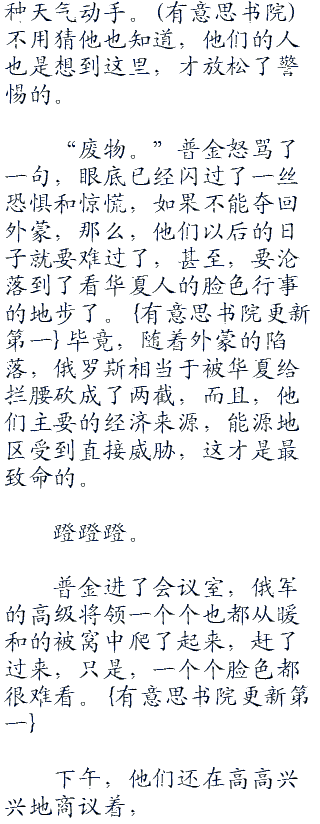 普金脸色大变,脚下一个踉跄,差点儿没一头栽倒在地。首发下午的时候,他派去外蒙的人才说,已经收买了外蒙的部队高层,只等着暴风雪停了,他们就能和平占领外蒙,可他吗的,这才多久,外蒙怎么就被华夏人给占领了?煮熟的鸭子就这么飞了?