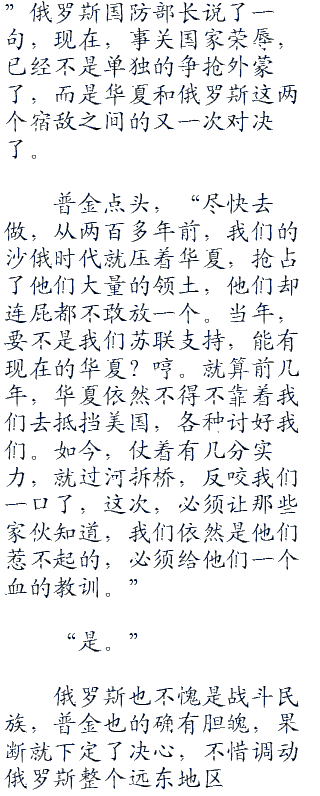 在座的每一个俄罗斯军政高层的脸上也都闪烁着冰冷的杀机,擅自进入一国境内,这就是不宣而战,毫无疑问,现在,他们完全可以对华夏宣战了。