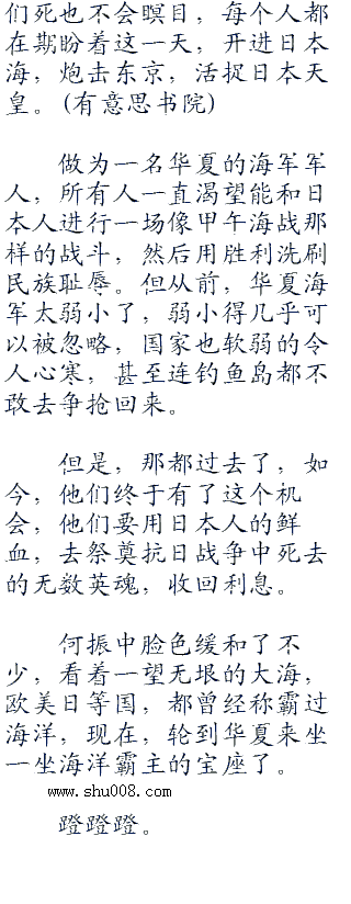 阳光照耀下,四个猩红的大字如此的耀眼,每一个华夏海军军人看见的时候,脸上都会出现一抹兴奋和激动之色,射日,射日,他们总算等到这一天了,要将日本鬼子给通通射死。