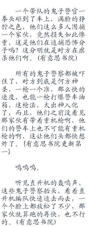追击而来的鬼子警察一个个脸色苍白,牙齿都快咬碎了,又有几个同事牺牲了,这已经不是在打他们的脸,这是赤luoluo地骑在他们的头顶上拉屎拉尿了,这么多警察抓不到一个恐怖分子,那他们只有去跳海了。