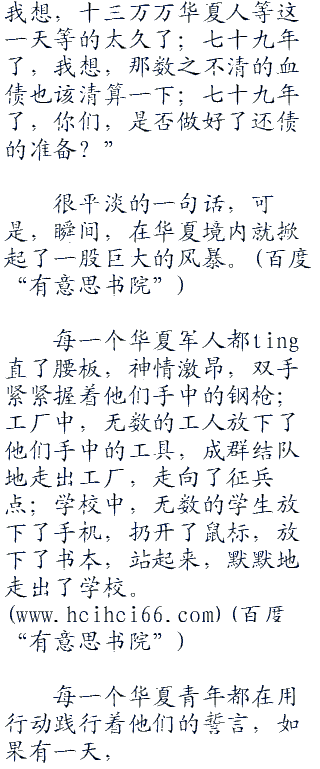 突然,在华夏的大地上,响起了嘹亮的国歌,从冰冷的东北到一望无垠的北疆隔壁,从青草油油的外蒙到碧波荡漾的南沙群岛,激昂的声音在整片华夏大地上飘扬着,清晰地传入了每一个华夏人的耳中。