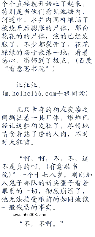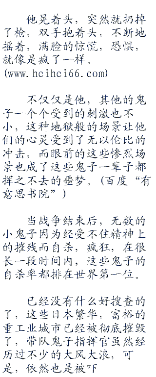 特别是当大火渐渐熄灭,成群结队的鬼子兵进入了城市,可是,大火过后那毛骨悚然的情景令他们惊恐到无法形容的地步,里面的惨烈远远超过他们所有人的想象。