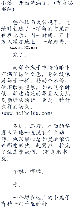 很快,此起彼伏的声音就响了起来,根本来不及去找厕所,周围的鬼子只能跑到一边,躲在废墟之后,一蹲,裤子一拉,就开始释放起来。