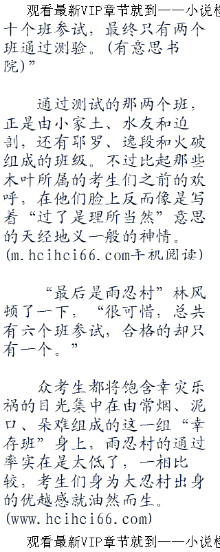 “现在公布测验结果。”林风的语调非常平淡,但在考场内听着的学生们的心却都提了起来:“首先是木叶村,总计三十二个班参试,通过的仅有九个班,他们分别是水门斑、大神班、天月班”