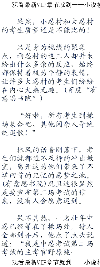 随着林风和水门交谈的结束,三十秒的计时也到达了终点,这标志着中忍考试的第一场终于正式落下了帷幕。