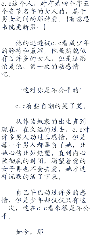 她清楚的感觉到,自己那颗早已死寂的,早已陷入绝望的心脏,再次跳动了起来,那跳动的心脏是如此的澎湃,它貪婪的吸收着阳光,让已经对一切再无感觉,只是沉默的看着世界的c.c,再次感觉到了少女才有的冲动。