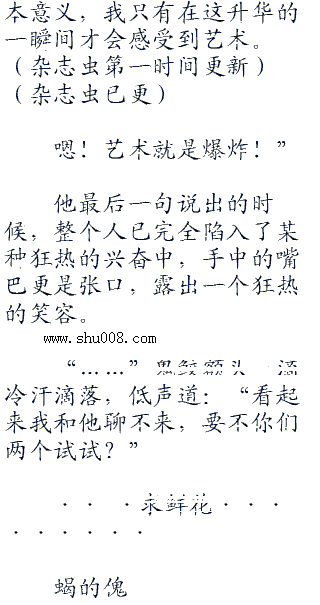 “很好,新的艺术品就要现世了,这次一定要让他们领略真正的艺术,嗯!”少年嘴里不知道说些什么,眼中的兴奋之色更浓了。