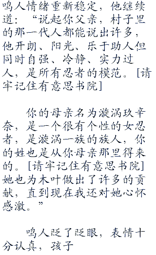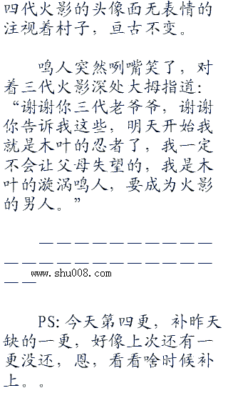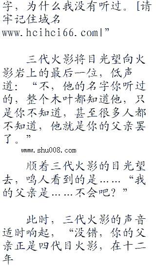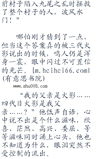 鸣人眼睛一大了,高兴道:“我就知道,我的父亲一定是一个大英雄,我做梦的时候曾经梦到过。快告诉我……快告诉我他的名