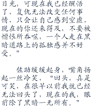佐助缓缓起身,嘴角扬起一丝冷笑,“回头,真是可笑,在很早以前我就已经无法回头了,现在的我,眼前除了黑暗一无所有。”