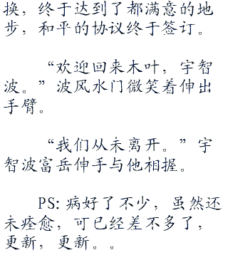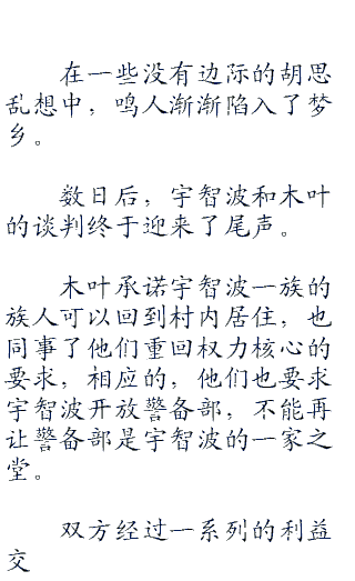 “鼬、止水,先让族人们去治疗吧,等到伤好后准备和木叶的谈判,重新拟定好章程,就交给你们两个负责了。”